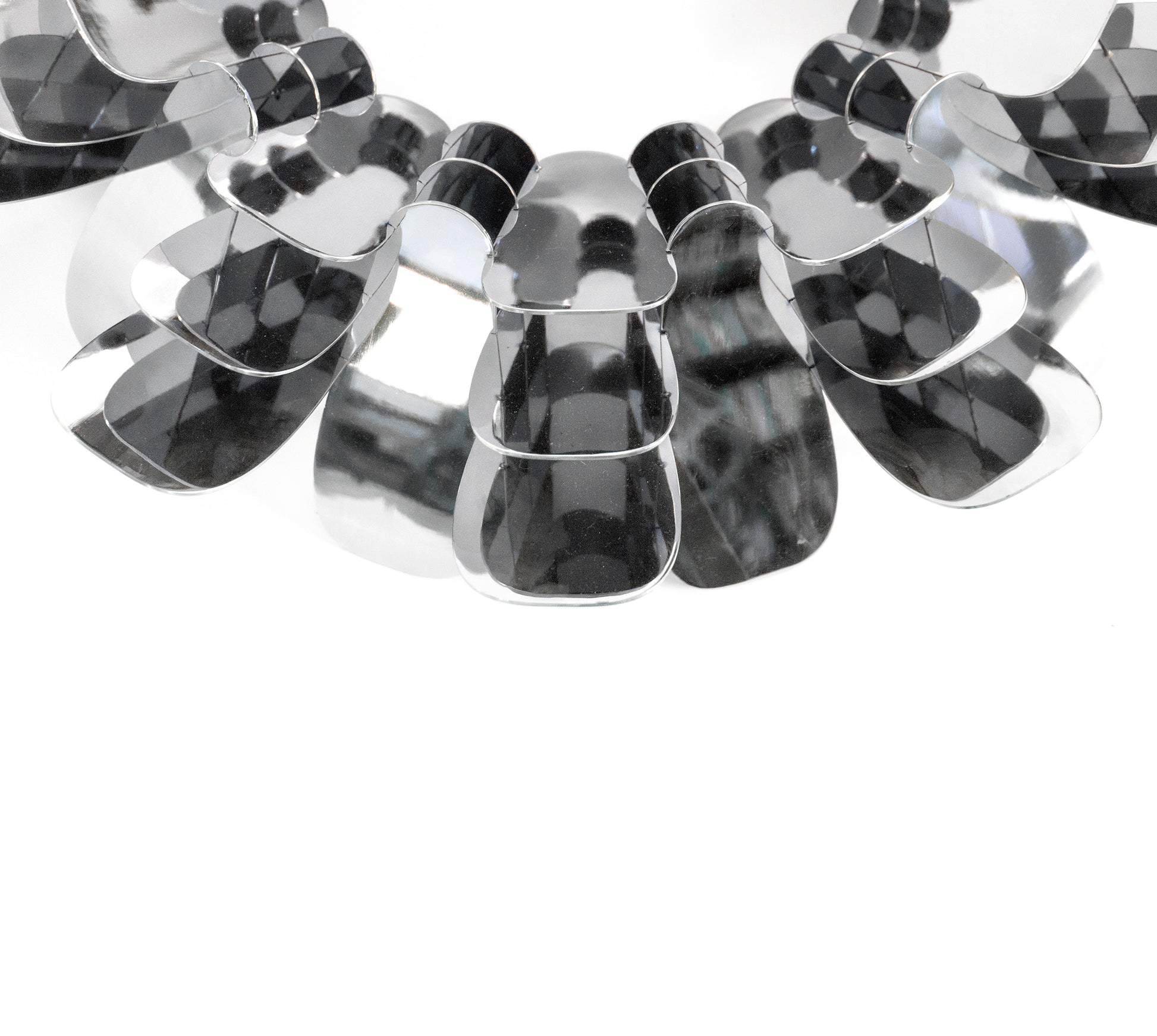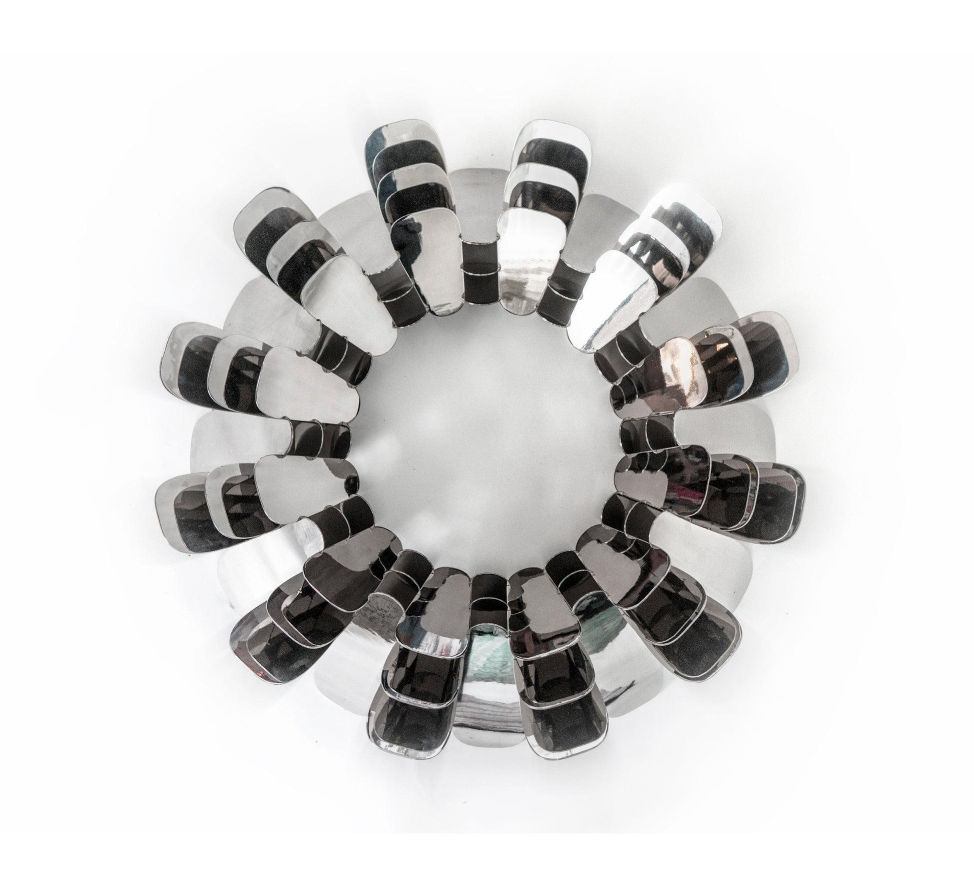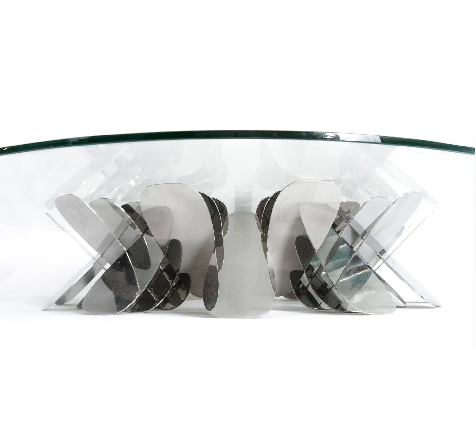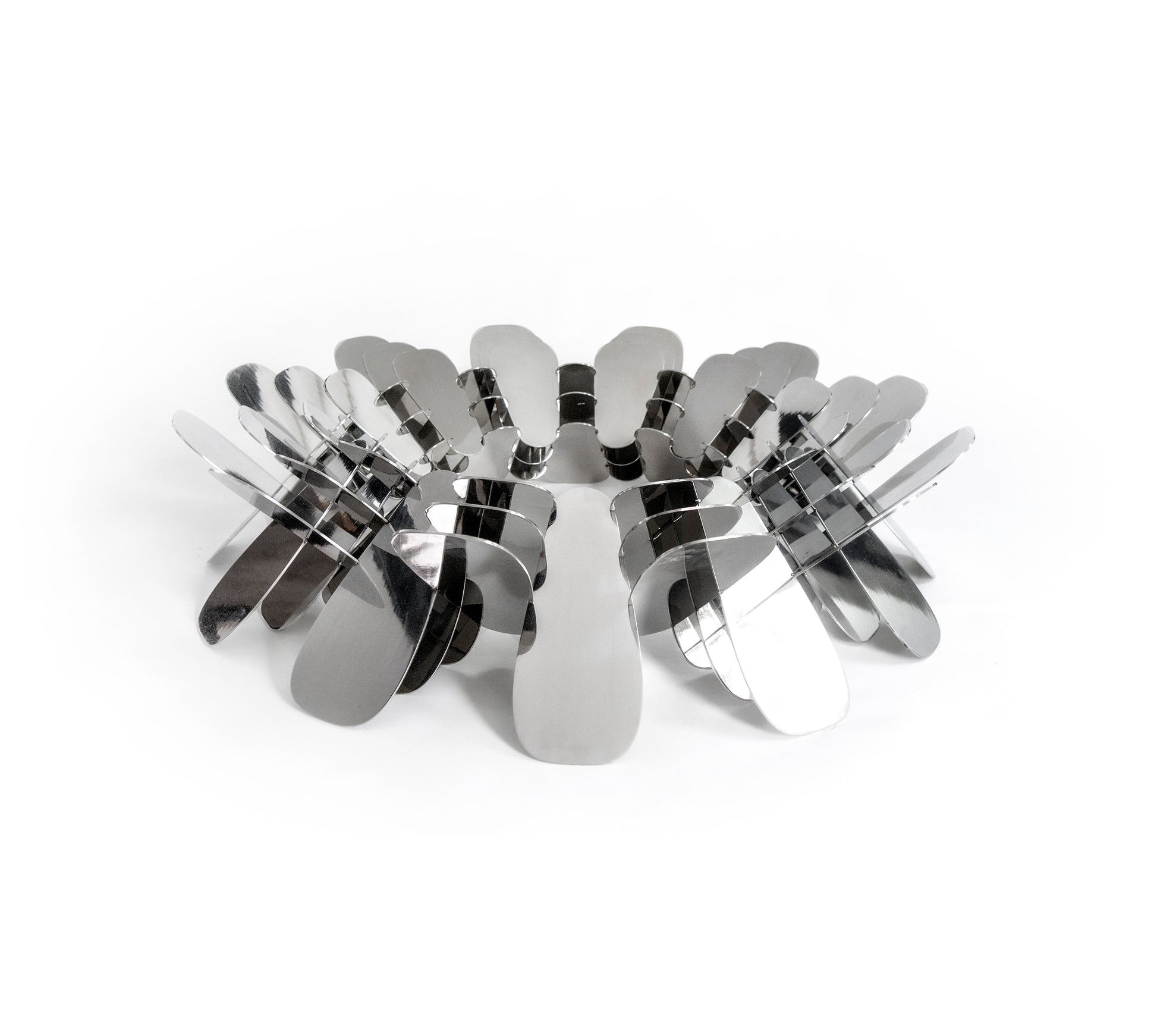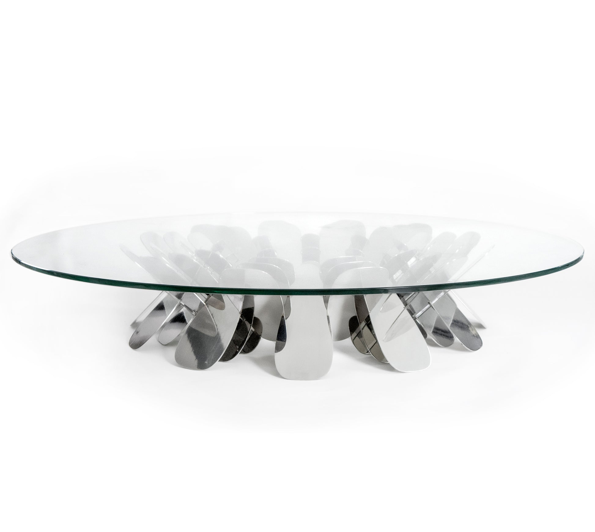 La mesa de centro Narciso se inspira en el mito griego homónimo de Narciso, quien, enamorado de su propia imagen y al verla reflejada en un estanque, se arrojó a las aguas para perseguirla. La pieza está formada por una estructura modular de pétalos de acero inoxidable de tres tamaños diferentes, soldados simétricamente alrededor de un eje central, formando un círculo perfecto. El sistema geométrico se basa en un antiprisma de doce lados construido con piezas de acero inoxidable pulido, de modo que el material, previamente opaco, adquiere un acabado de espejo que le permite integrarse con su entorno.